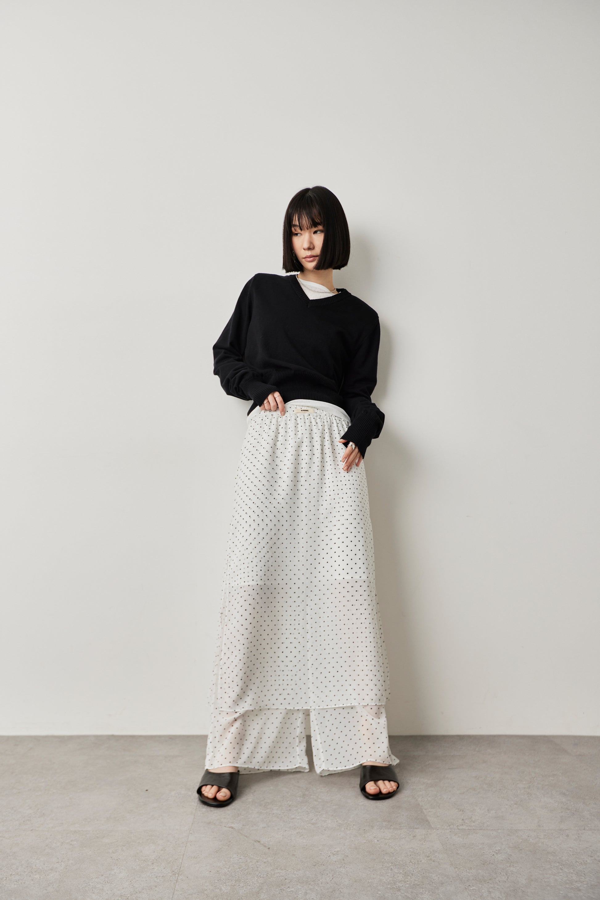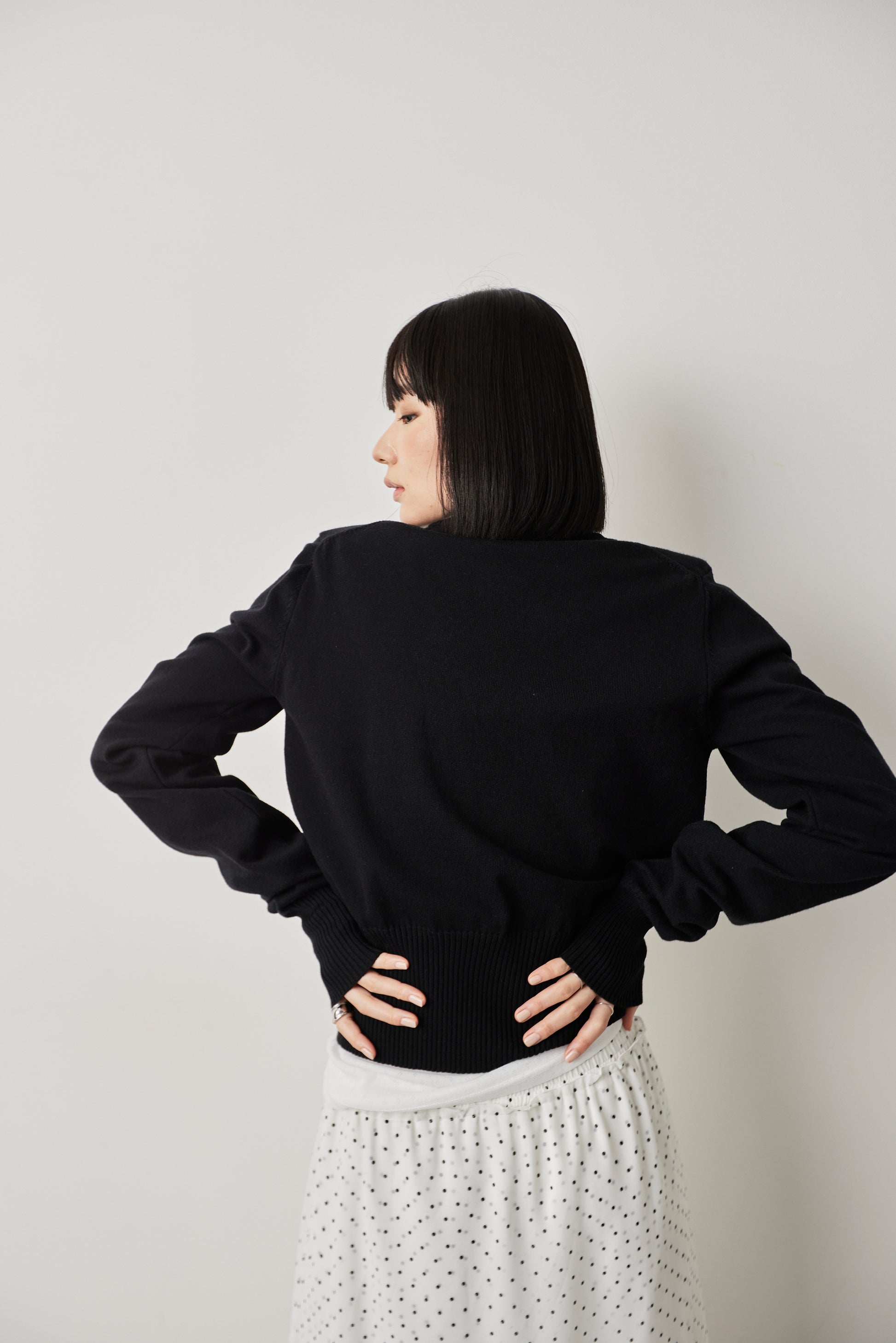 天竺編みならではのフラットで上品な表情が、肩パッドのモード感を引き立てつつ、デイリーに取り入れやすいバランスに仕上げています。