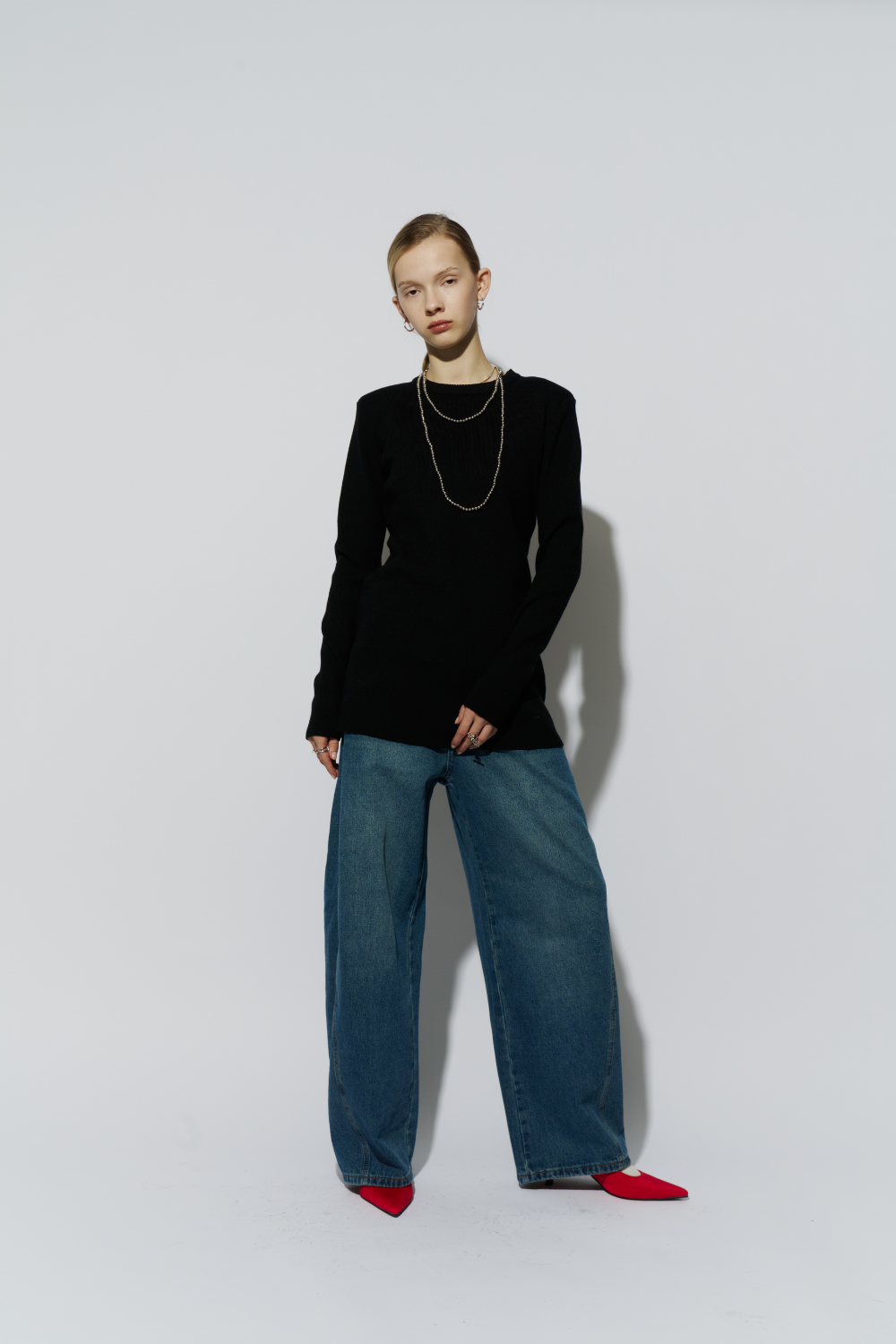 細かなRIB編みで仕立てた、パワーショルダーデザインのロングニットトップス。