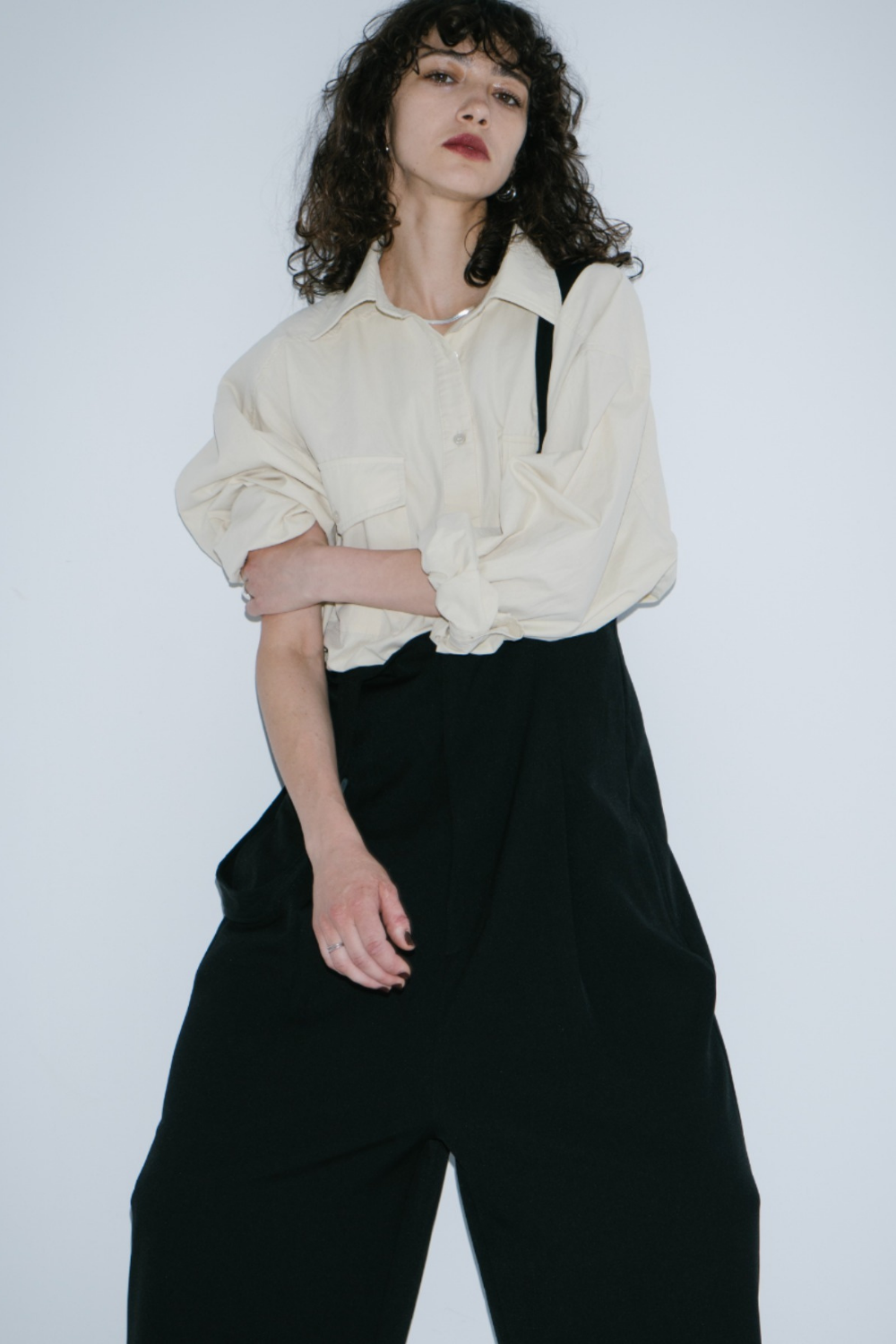 サスペンダー付きのデザインがスタイルに奥行きを与え、シンプルながら存在感のある1本に仕上げています。
