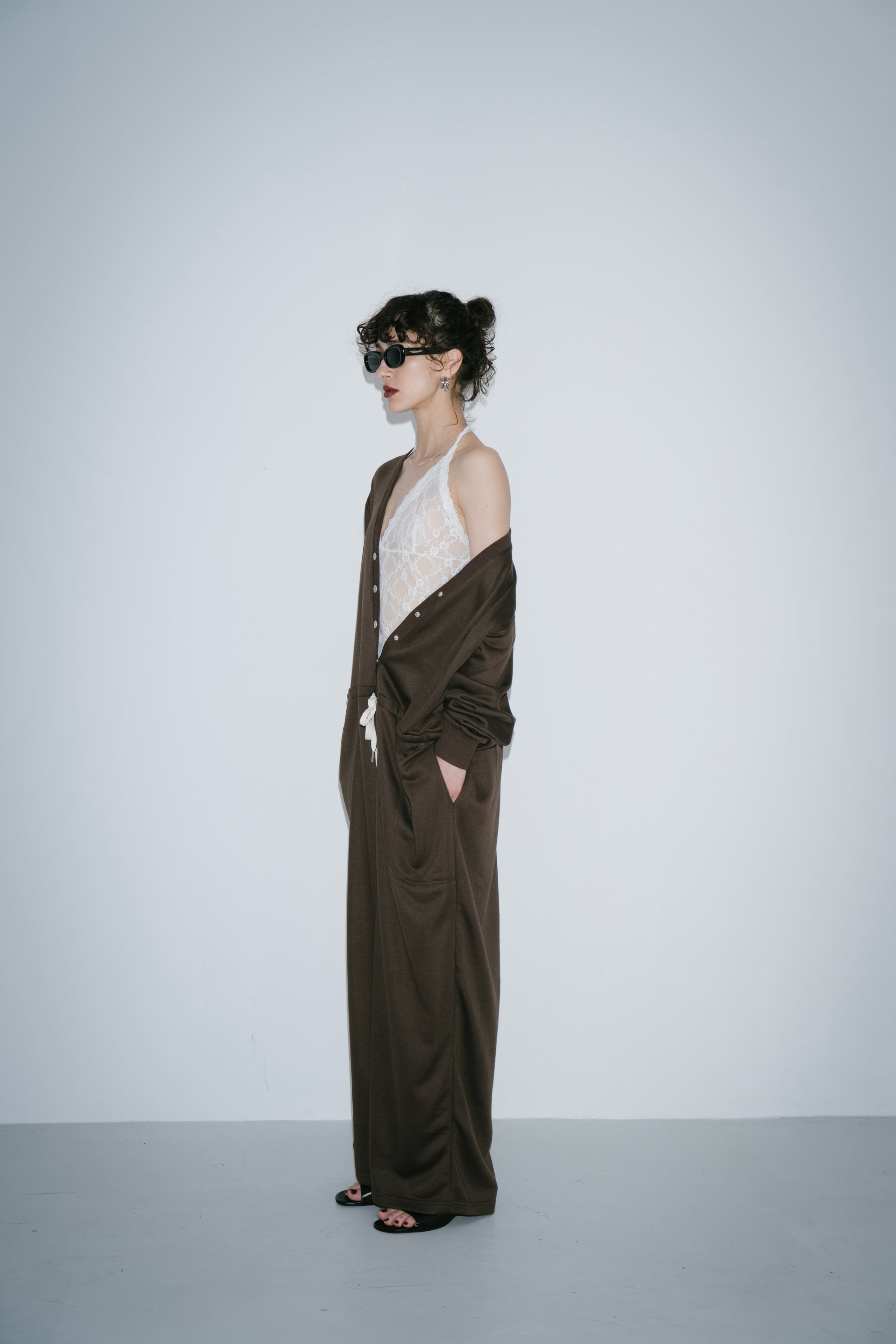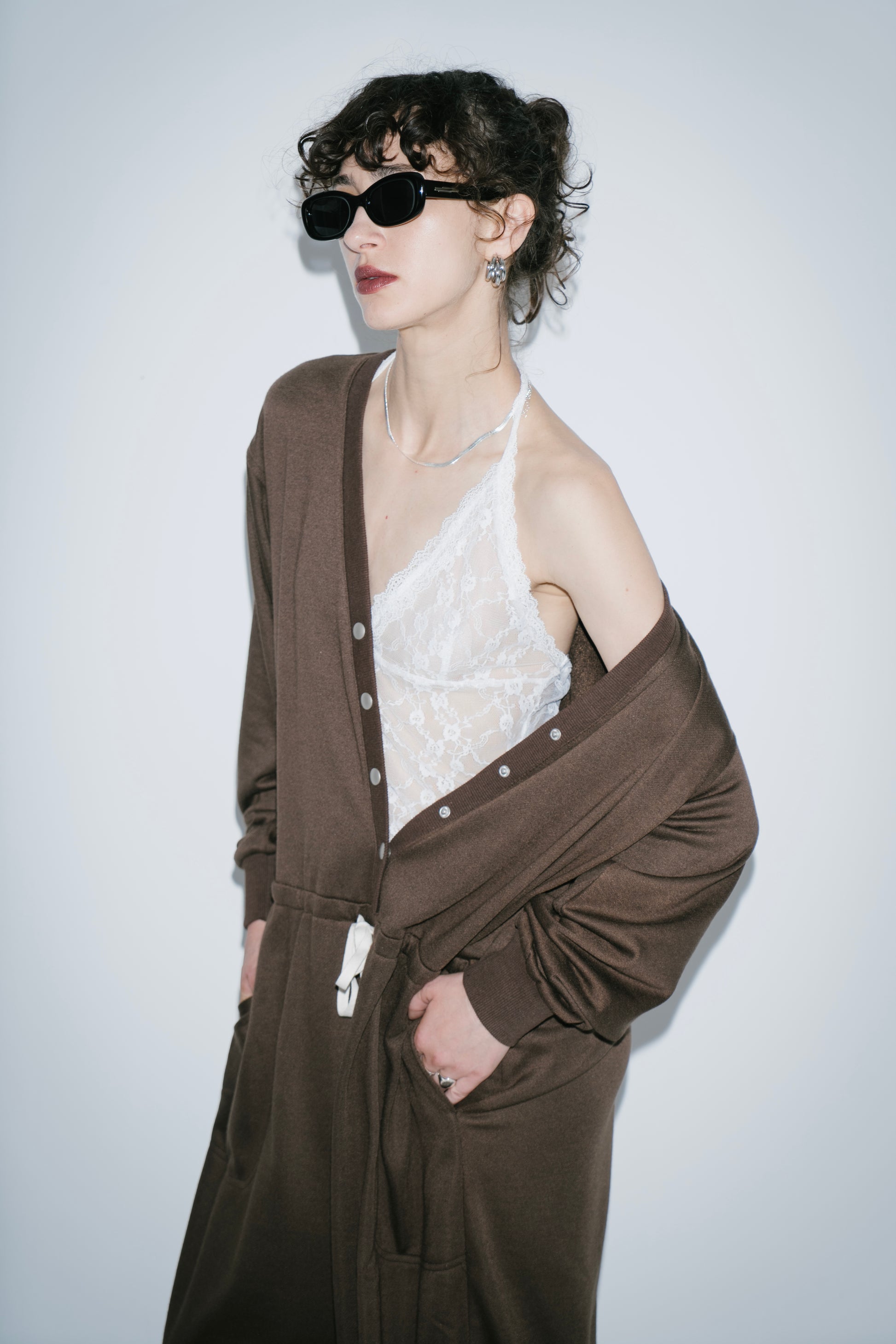 上品な透け感と繊細な花柄レースが女性らしさを引き立てながら、ホルターネックデザインがモードな印象をプラス。