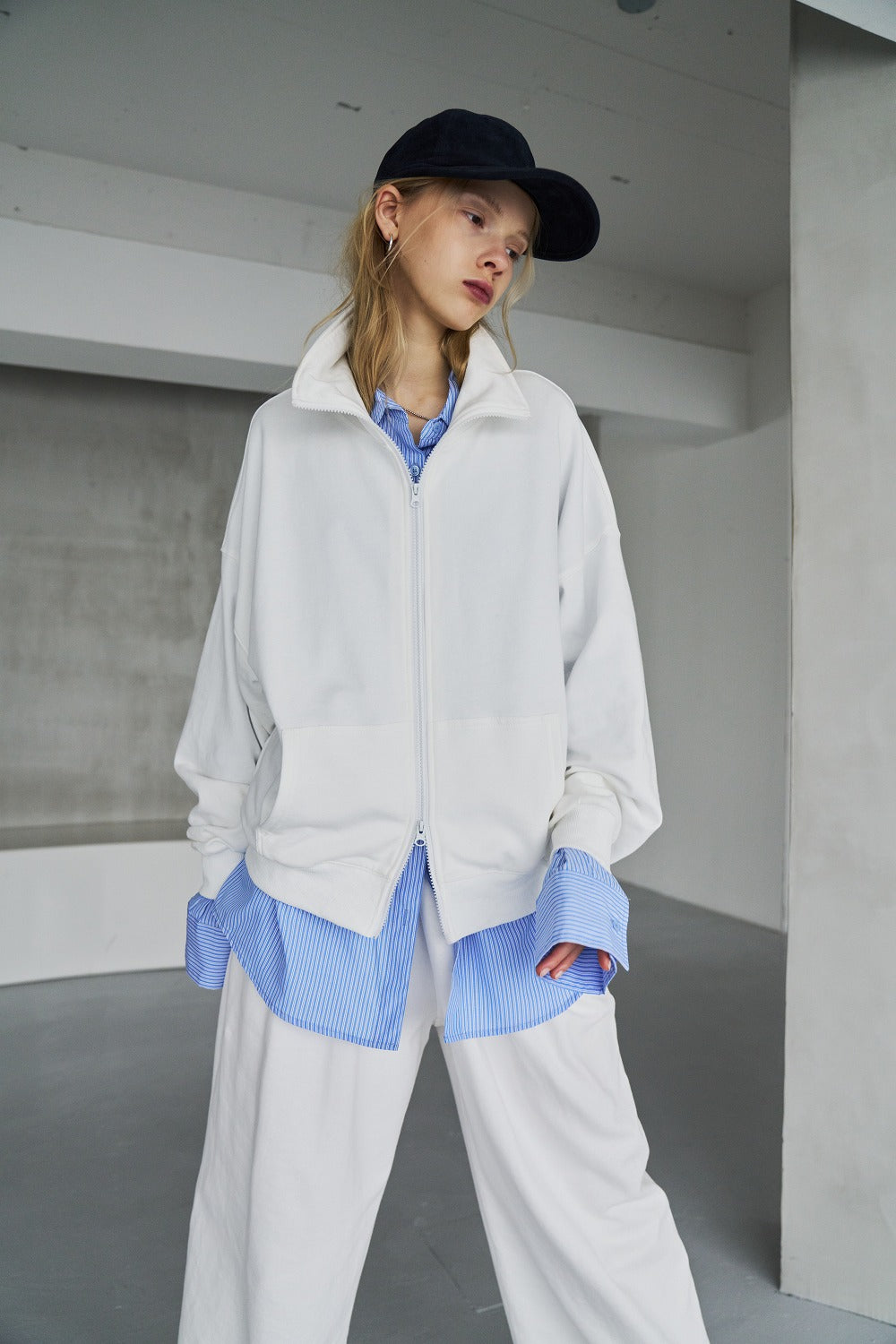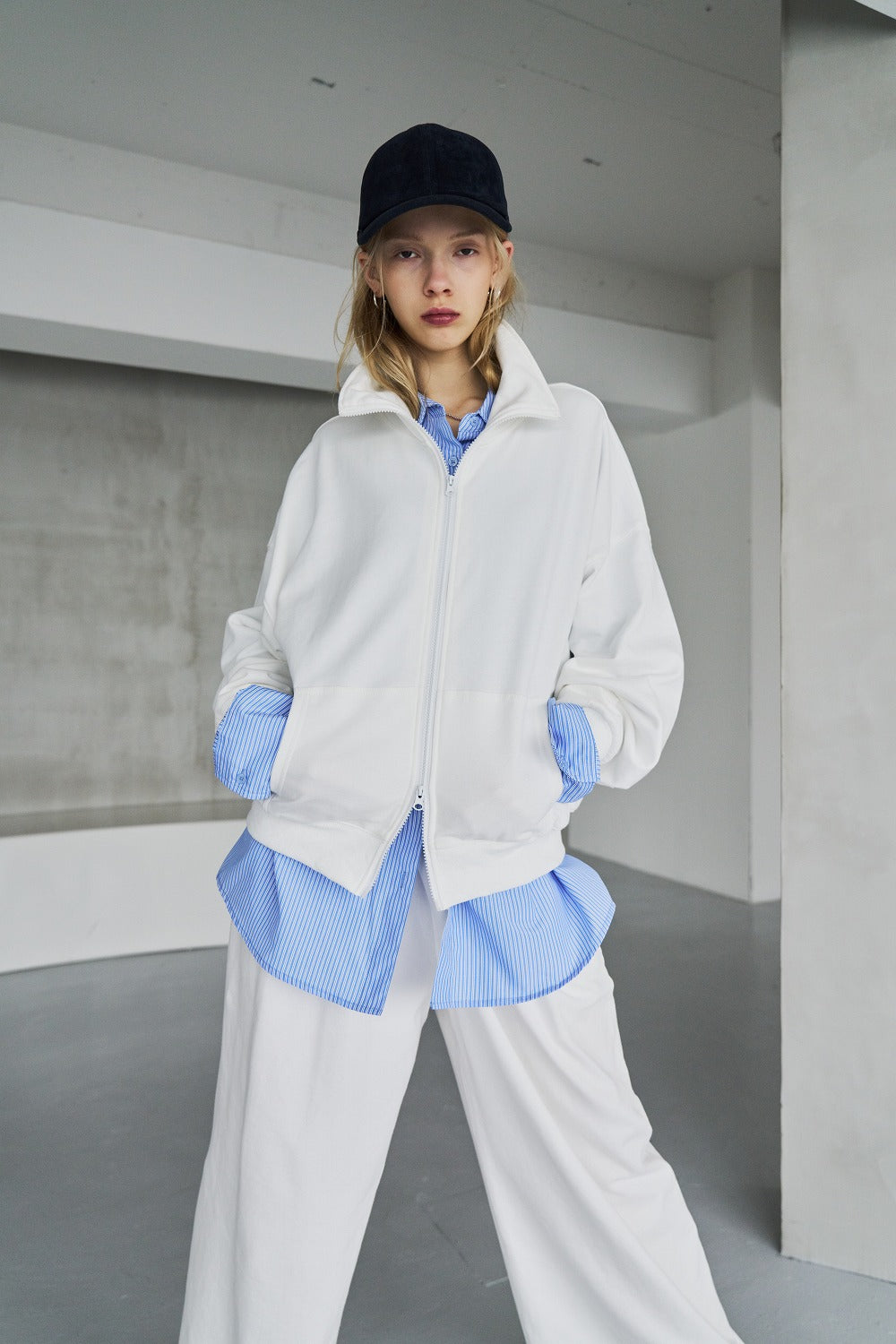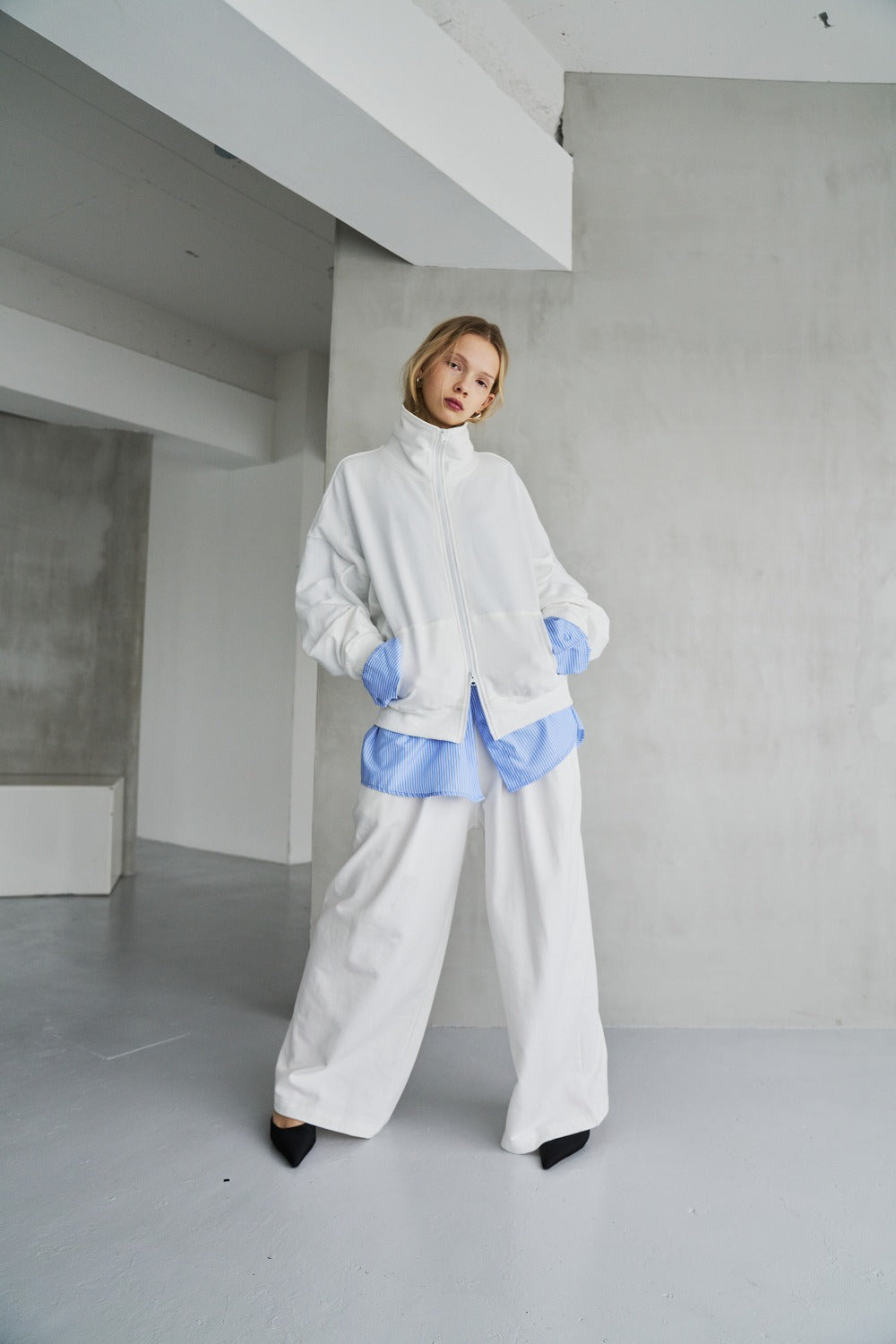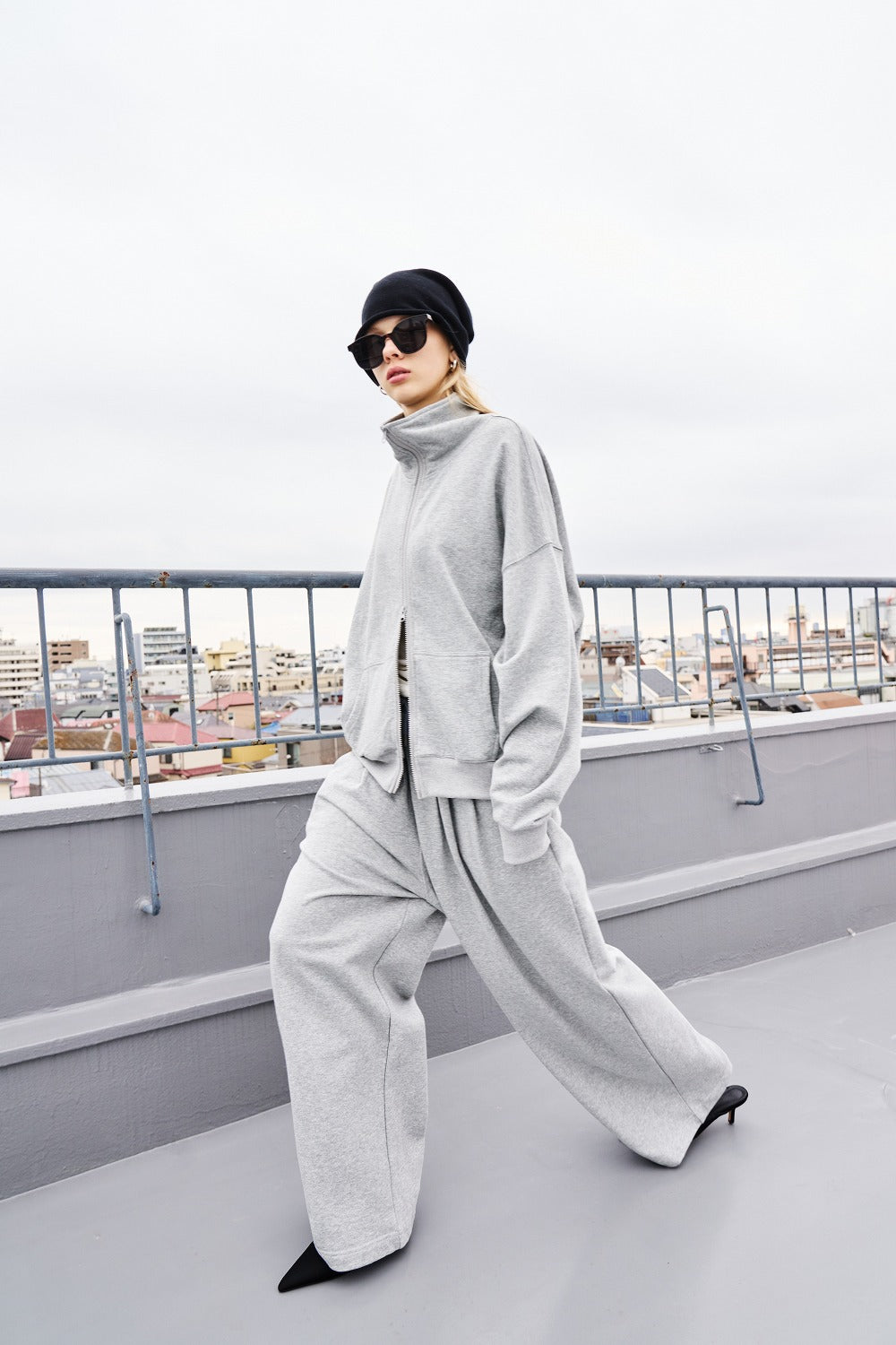 同素材のタックワイドスウェットパンツと合わせれば、セットアップとしても完成度の高いモードカジュアルが楽しめます。