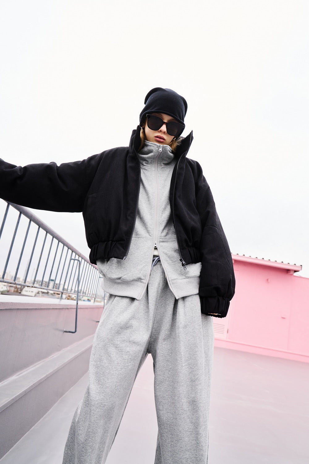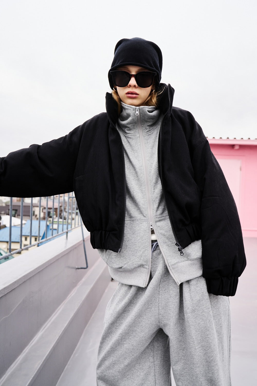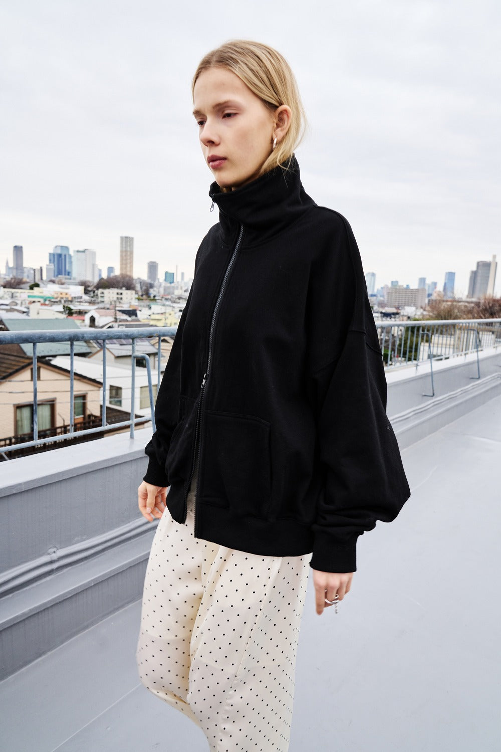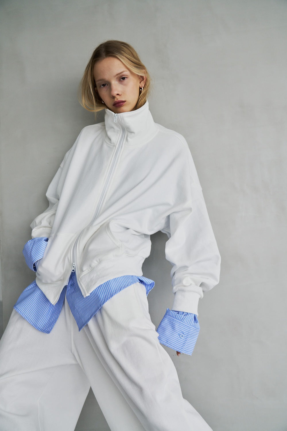 同素材のタックワイドスウェットパンツと合わせれば、セットアップとしても完成度の高いモードカジュアルが楽しめます。