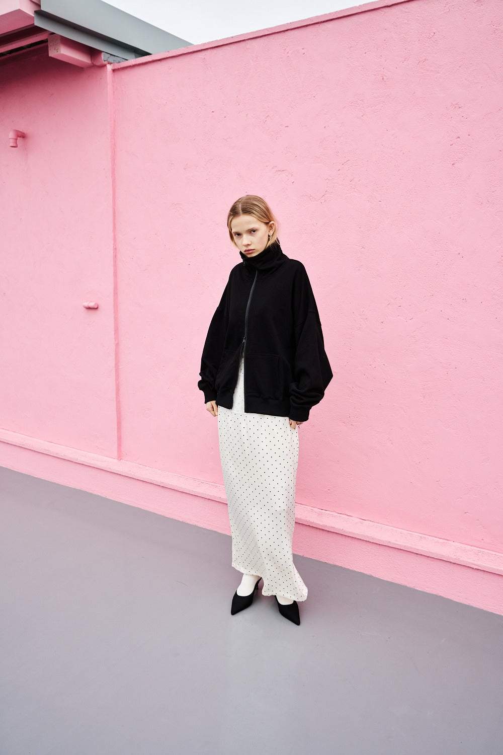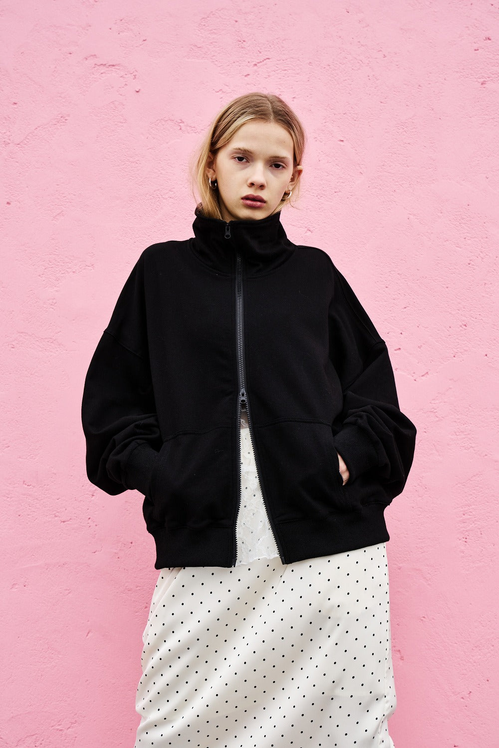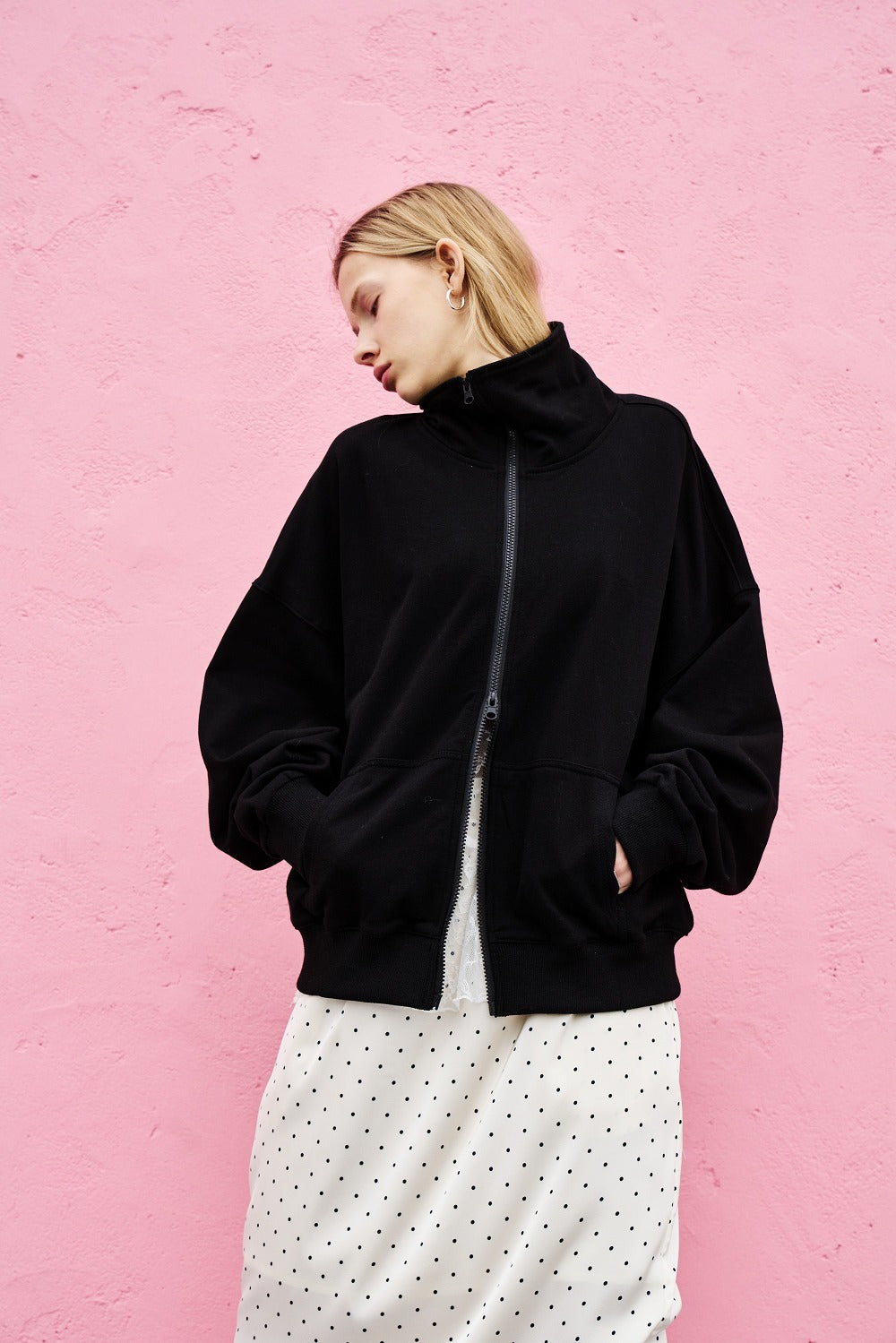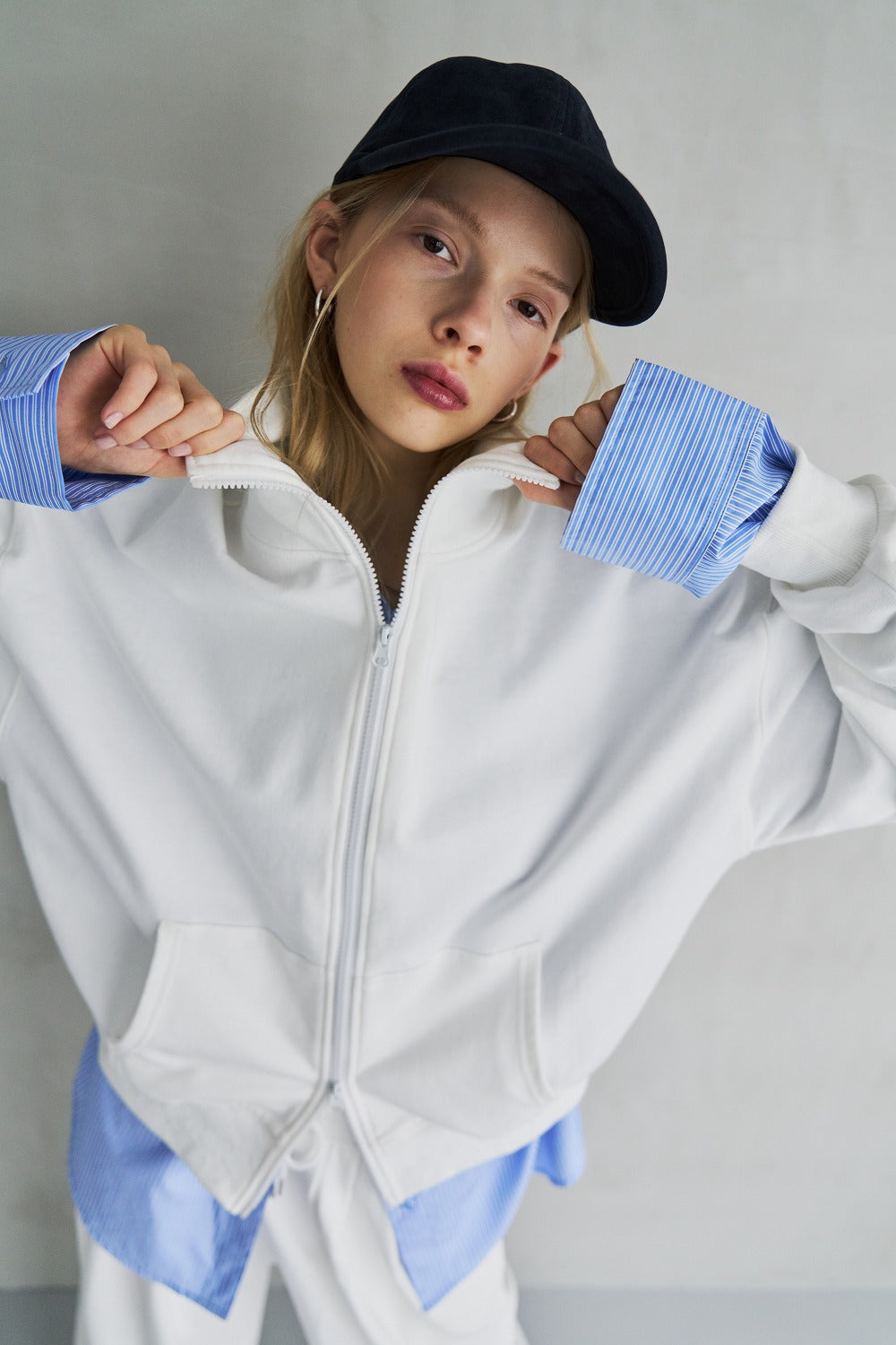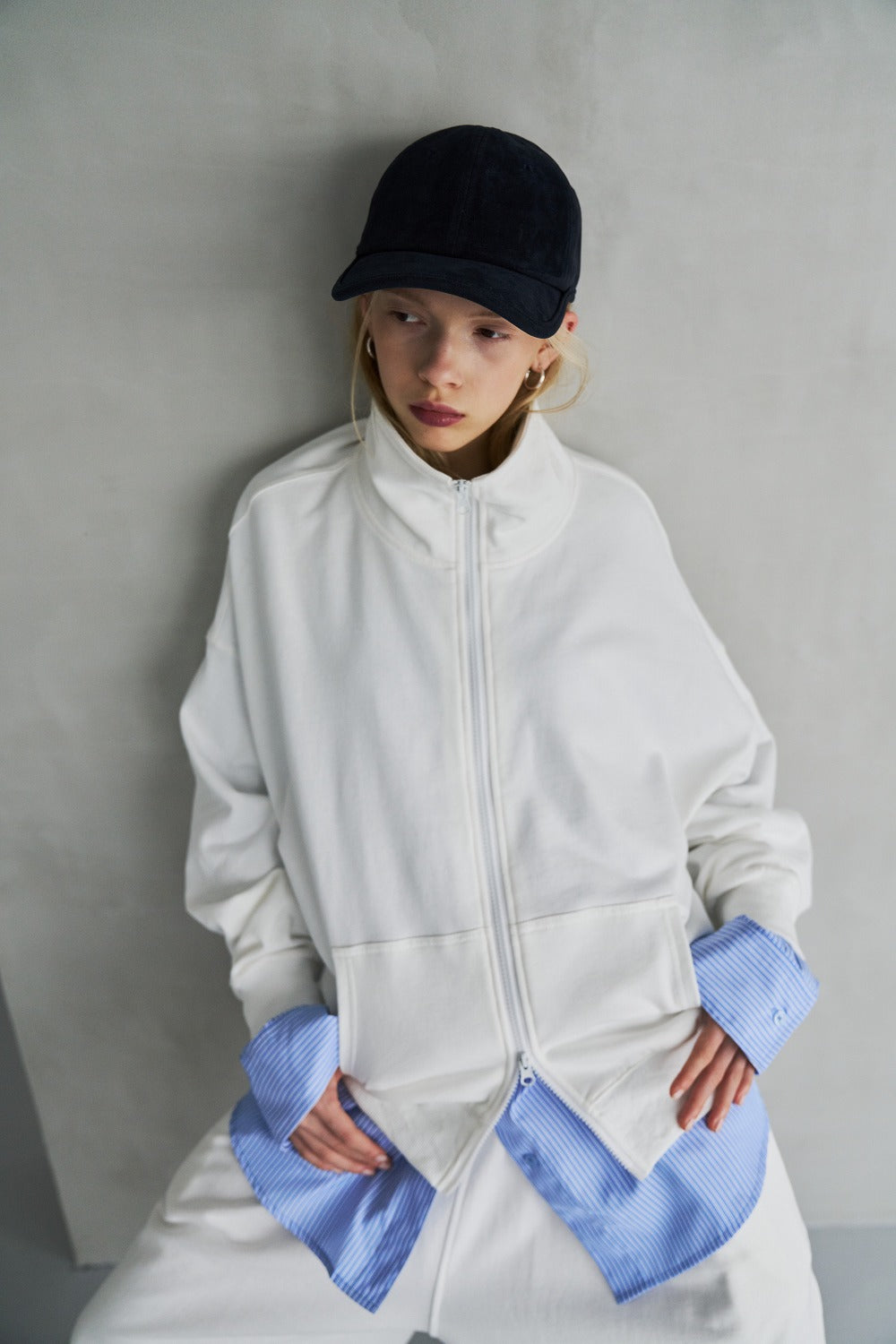ジップを閉めてトップス感覚で着るのはもちろん、インナーを覗かせたレイヤードスタイルもおすすめ。