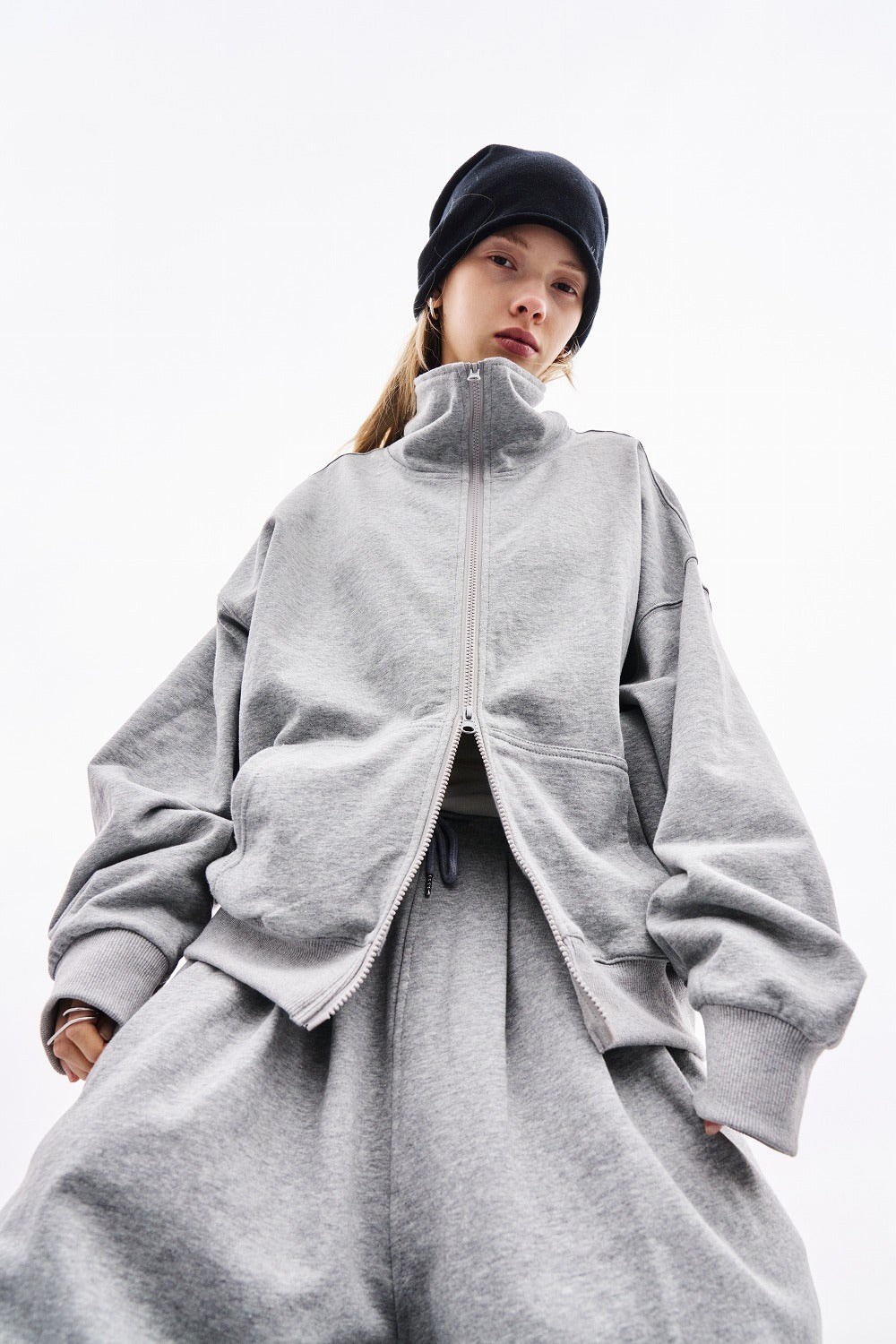 立ち上がりのあるネックとダブルジップ仕様で、開け方次第で表情を変えられるのが魅力です。
