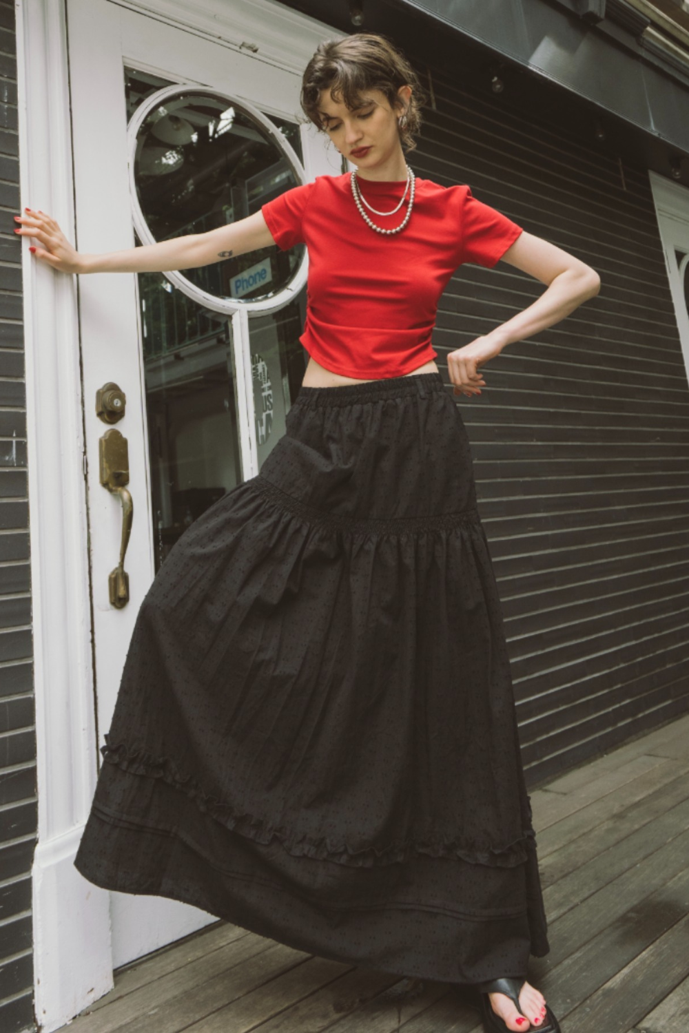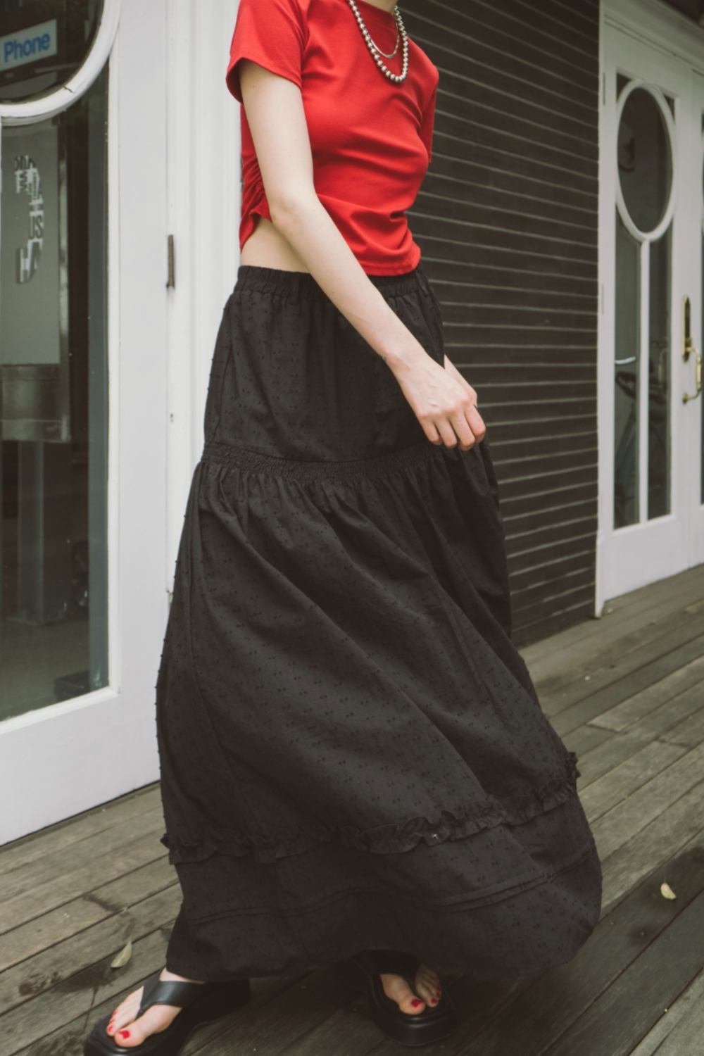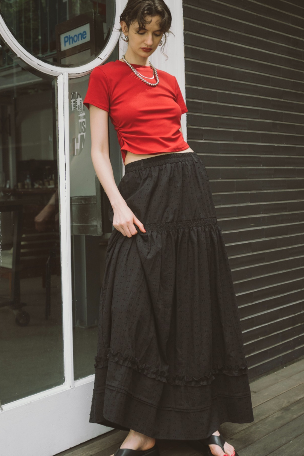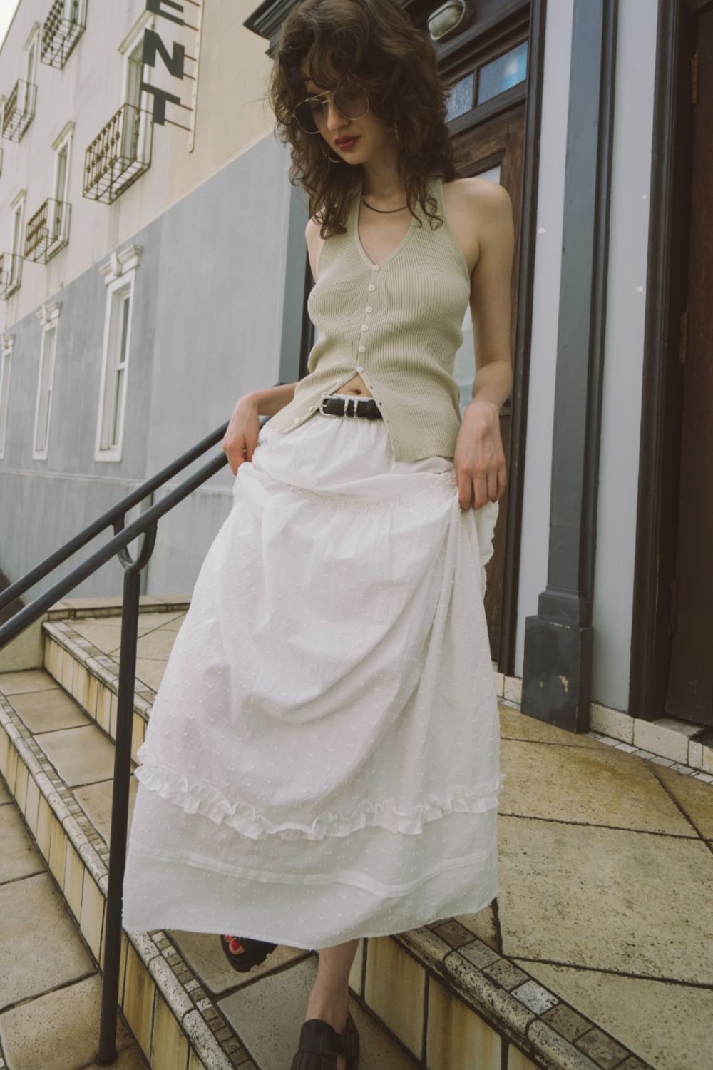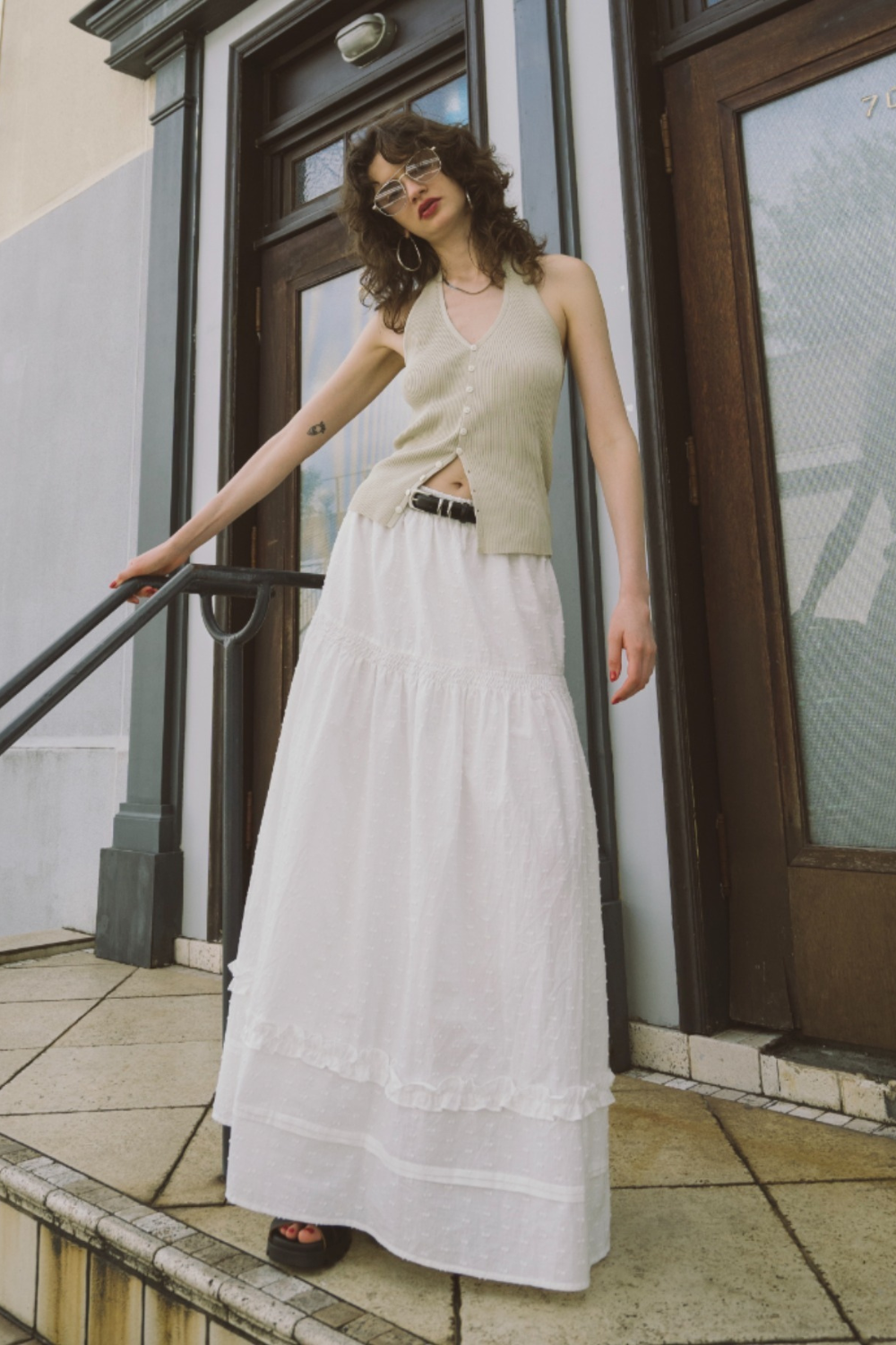 3段ティアードのたっぷりとしたボリュームで存在感がありつつ、動くたびに軽やかに揺れる華やかな1枚です。