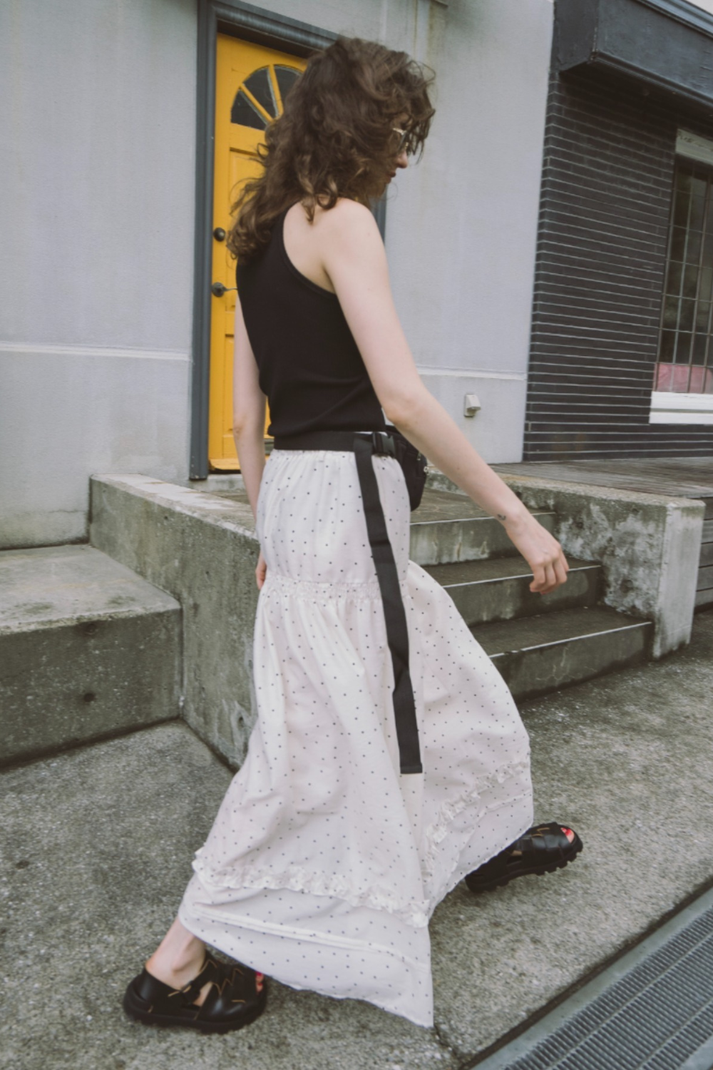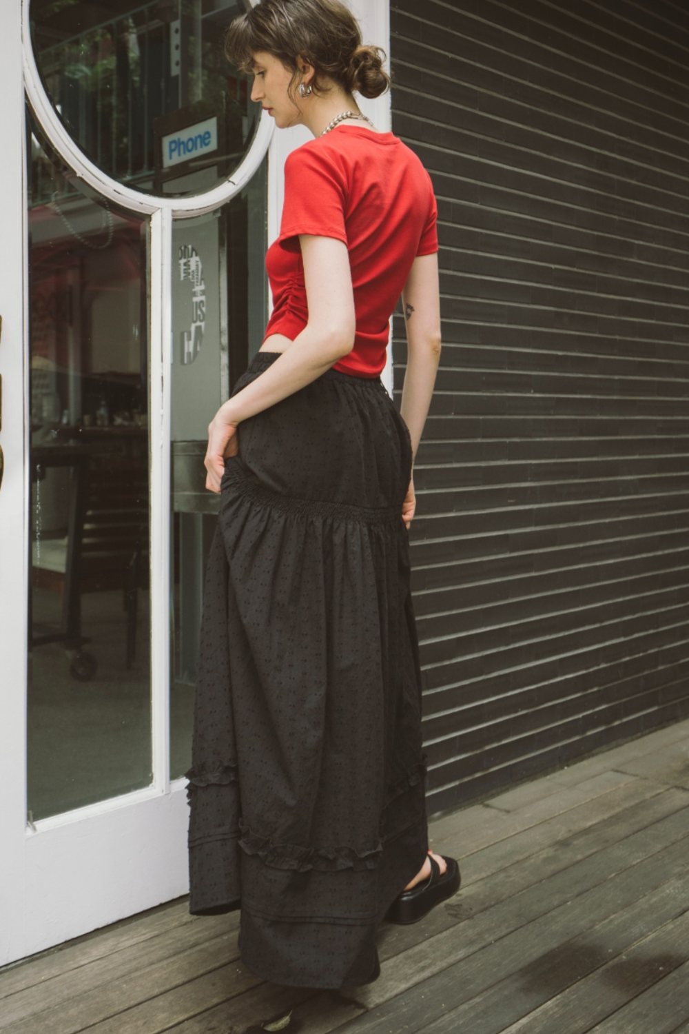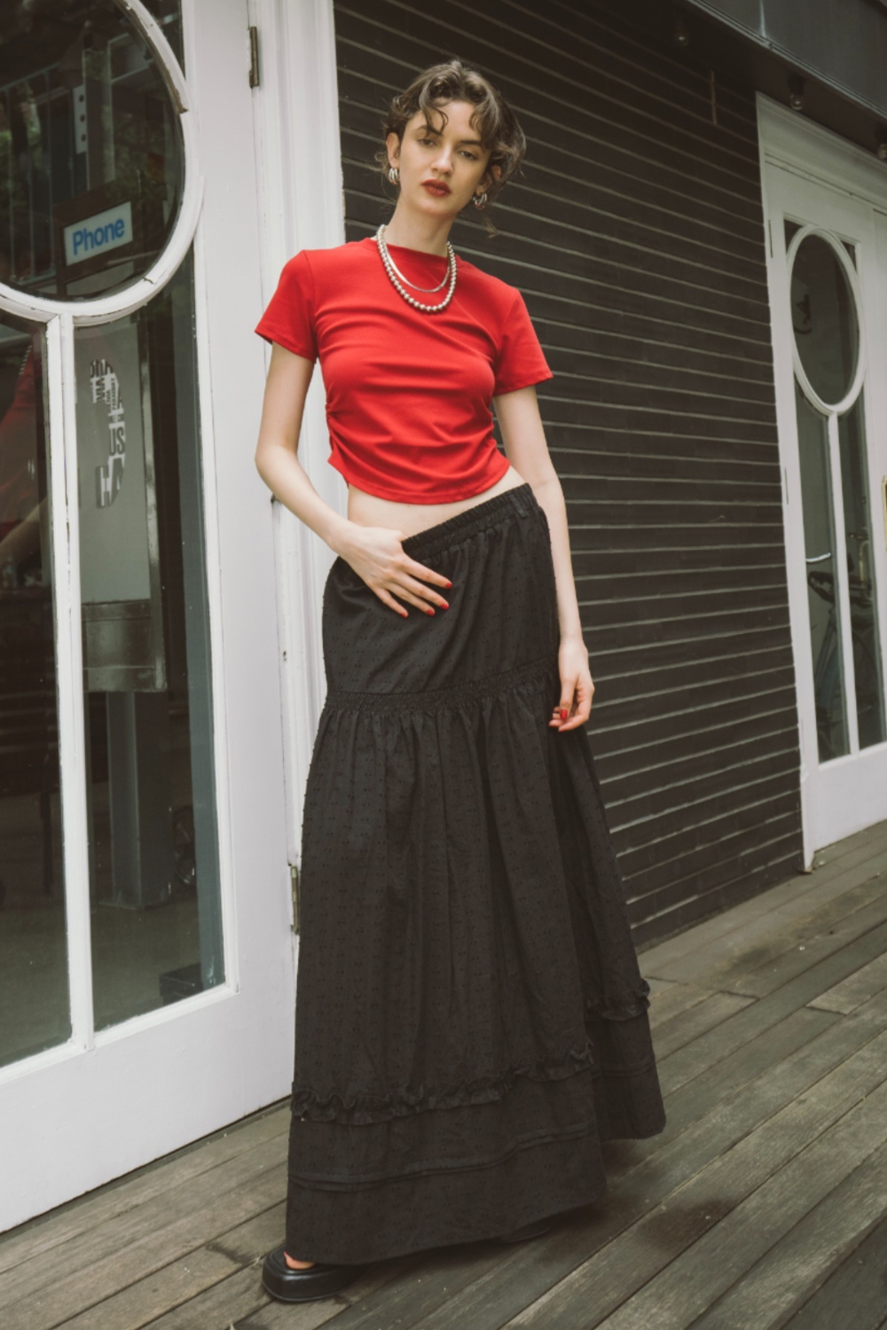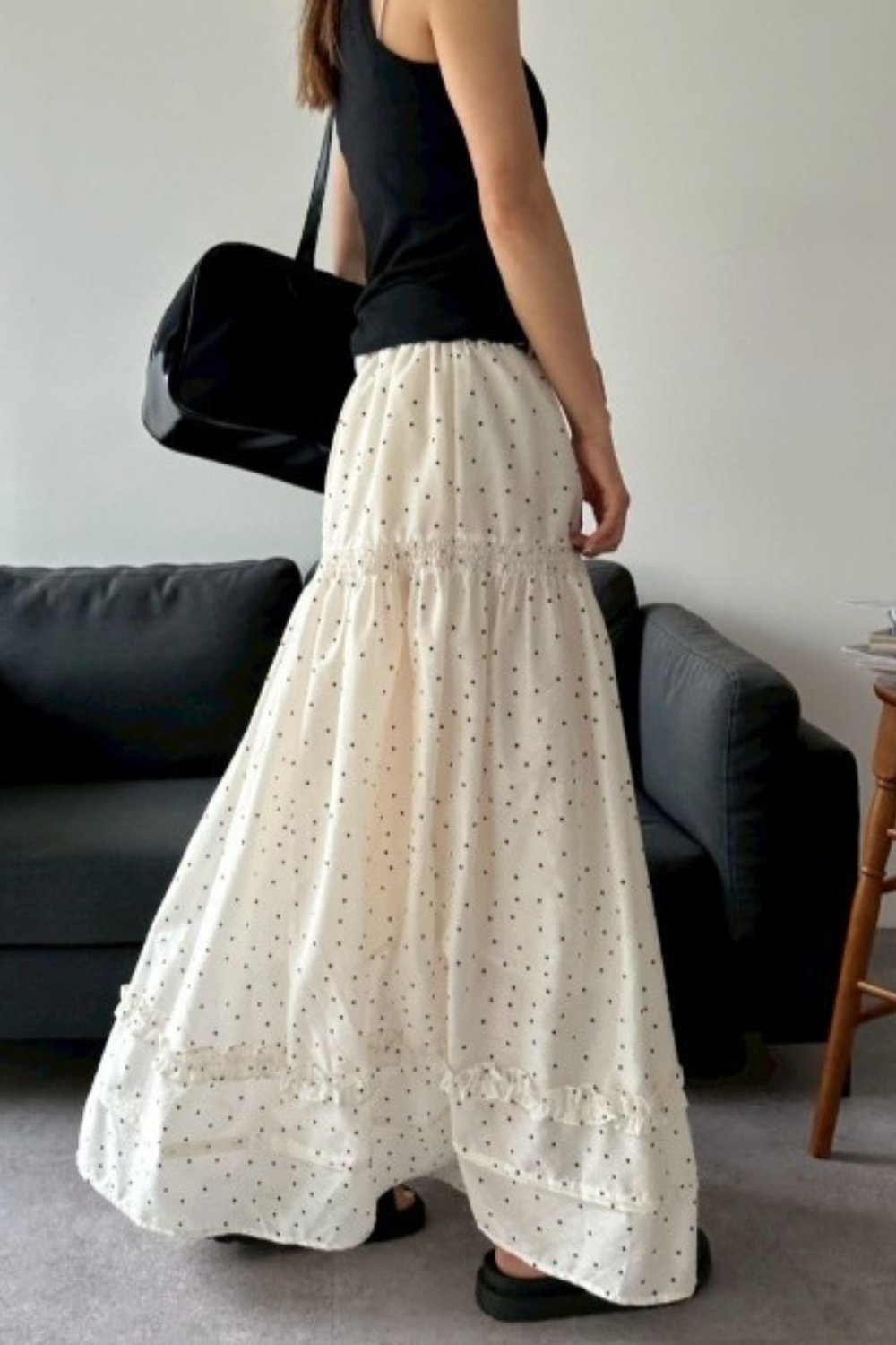 3段ティアードのたっぷりとしたボリュームで存在感がありつつ、動くたびに軽やかに揺れる華やかな1枚です。