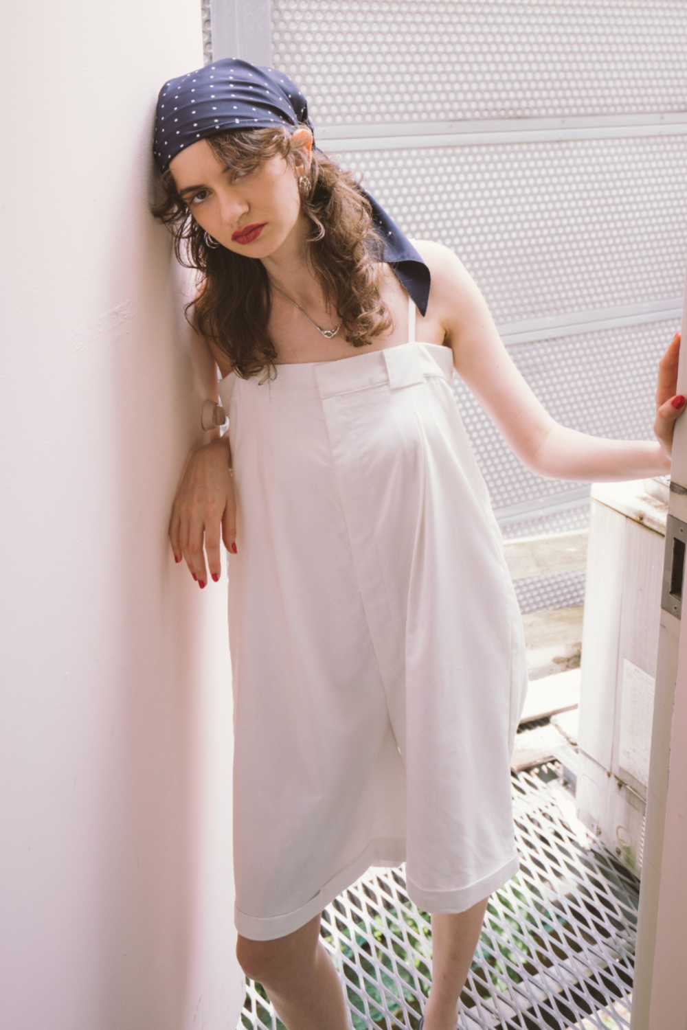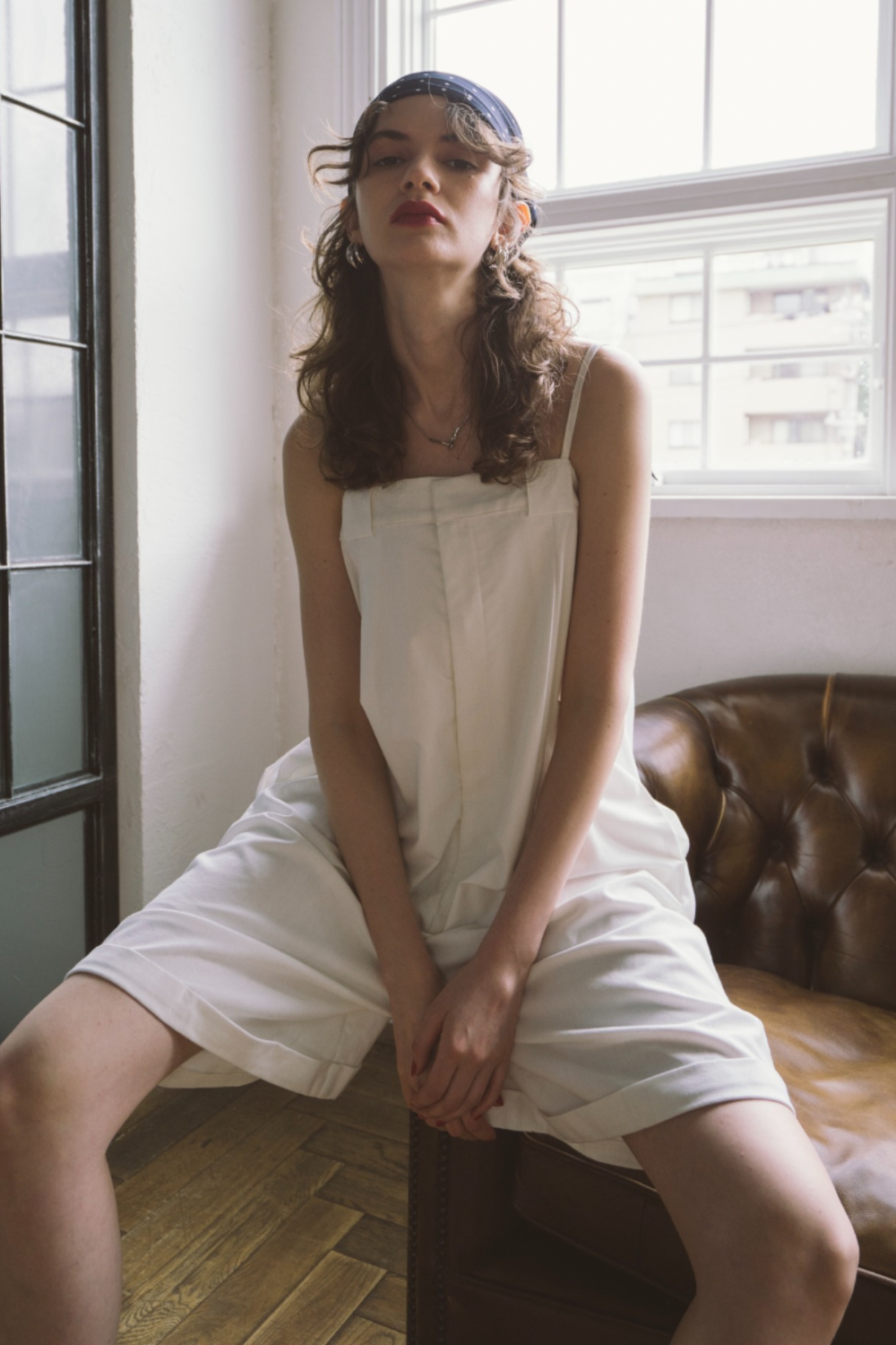 ストラップデザインと、膝丈のワイドなシルエットが目を惹くショートオールインワン。